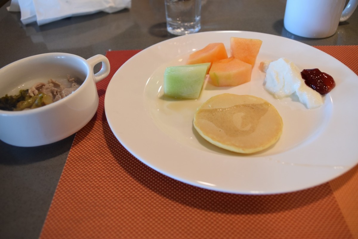 朝は肉類はなく、卵、ハム、パンケーキといったところでした。
