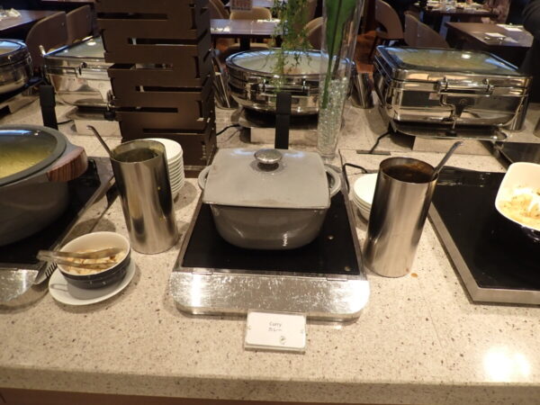 日曜日でしたが、ラウンジはおそらくスタートから居座る人でほぼ満席。写真を撮るのは勇気が要ったので、自分のお皿だけ写真を撮りました。