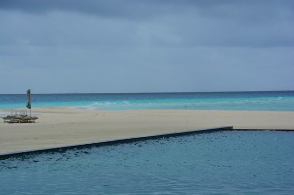 140820_173703_モルジブ_nikon雨なのでパラソルも閉じられてビーチにも人がいません。