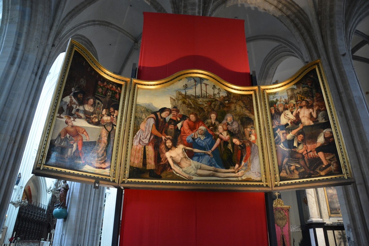 キリストの体は聖ヨハネ(赤い外套の人物)を含む人物群によって抱えられている。