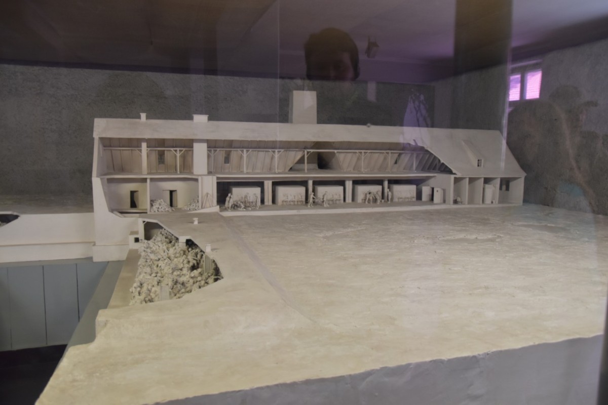 残りの人々は貨車を降りてから、さらに400m林の方へ歩かされ、「消毒室へ」の看板を目にしながら建物の地下へ誘導されました。
