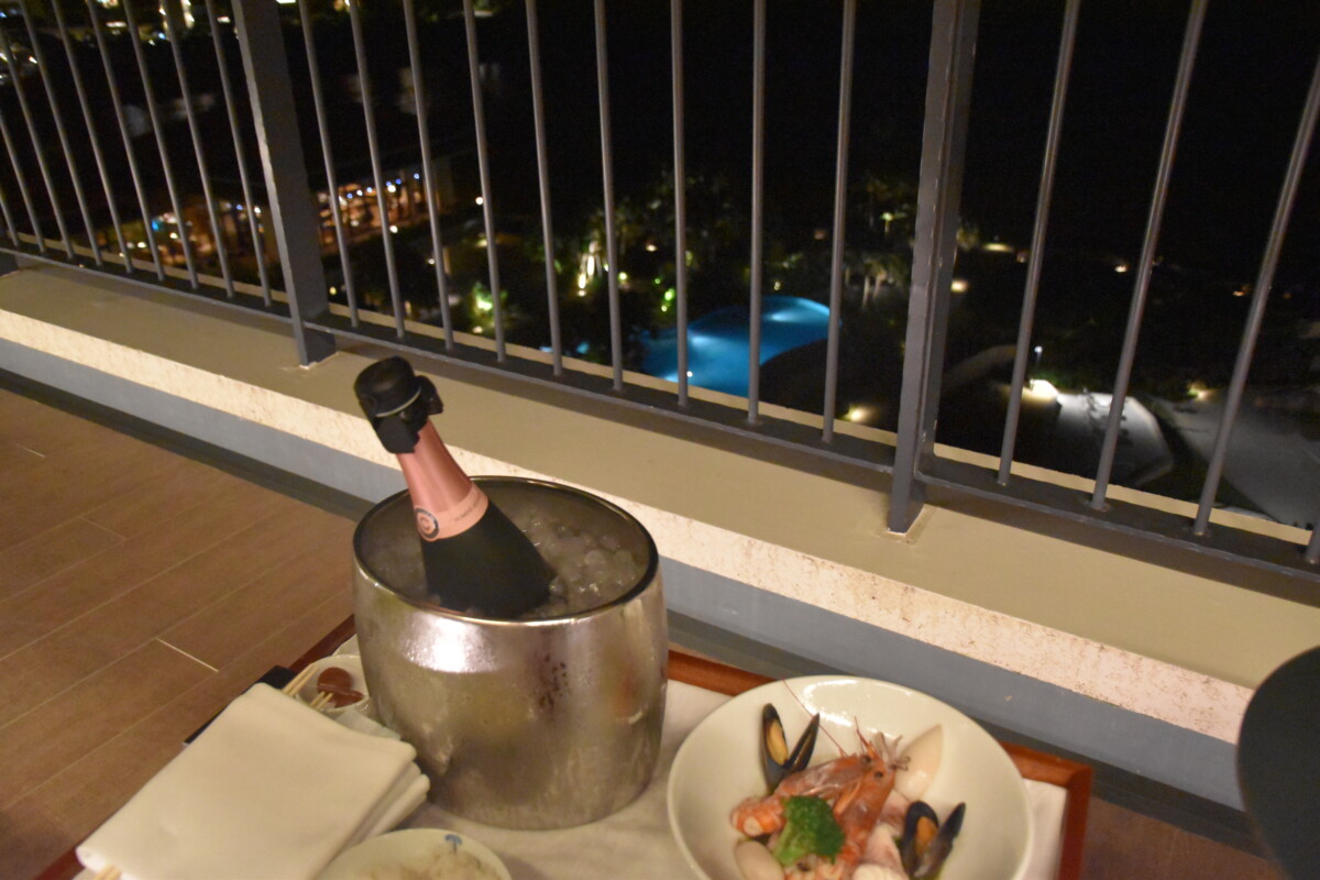瀬良垣ビーチの眺めをお楽しみいただきながら、優雅にディナーをご堪能いただく鉄板焼カウンター。沖縄県産の牛や豚、島野菜は当然ながら、国内外から取り寄せた旬の野菜、山菜、海鮮物、希少価値の高い醤油、塩、薬味等を使用します。